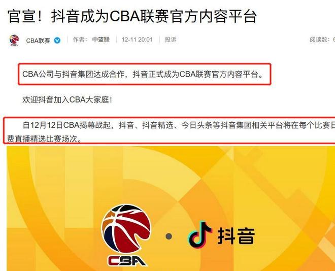 12月11日晚8点,CBA联赛官方发文官宣,说他们公司已经跟抖音集团达成了合作。