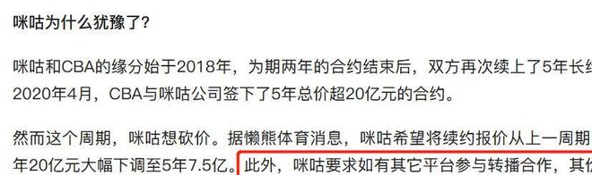 太往前的不说,就说上一次咪咕跟CBA签的合同,那可是足足20亿。